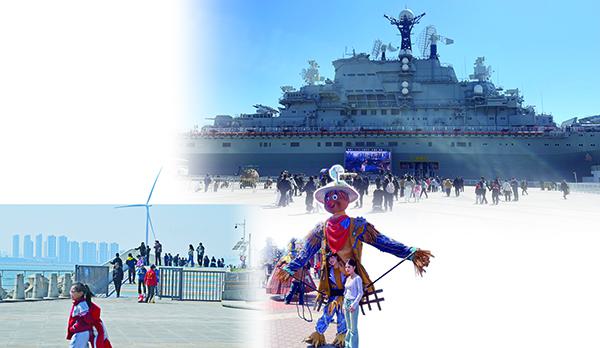 市民游客漫步于生态城东堤公园 泰达航母主题公园推出丰富多彩的节日活动